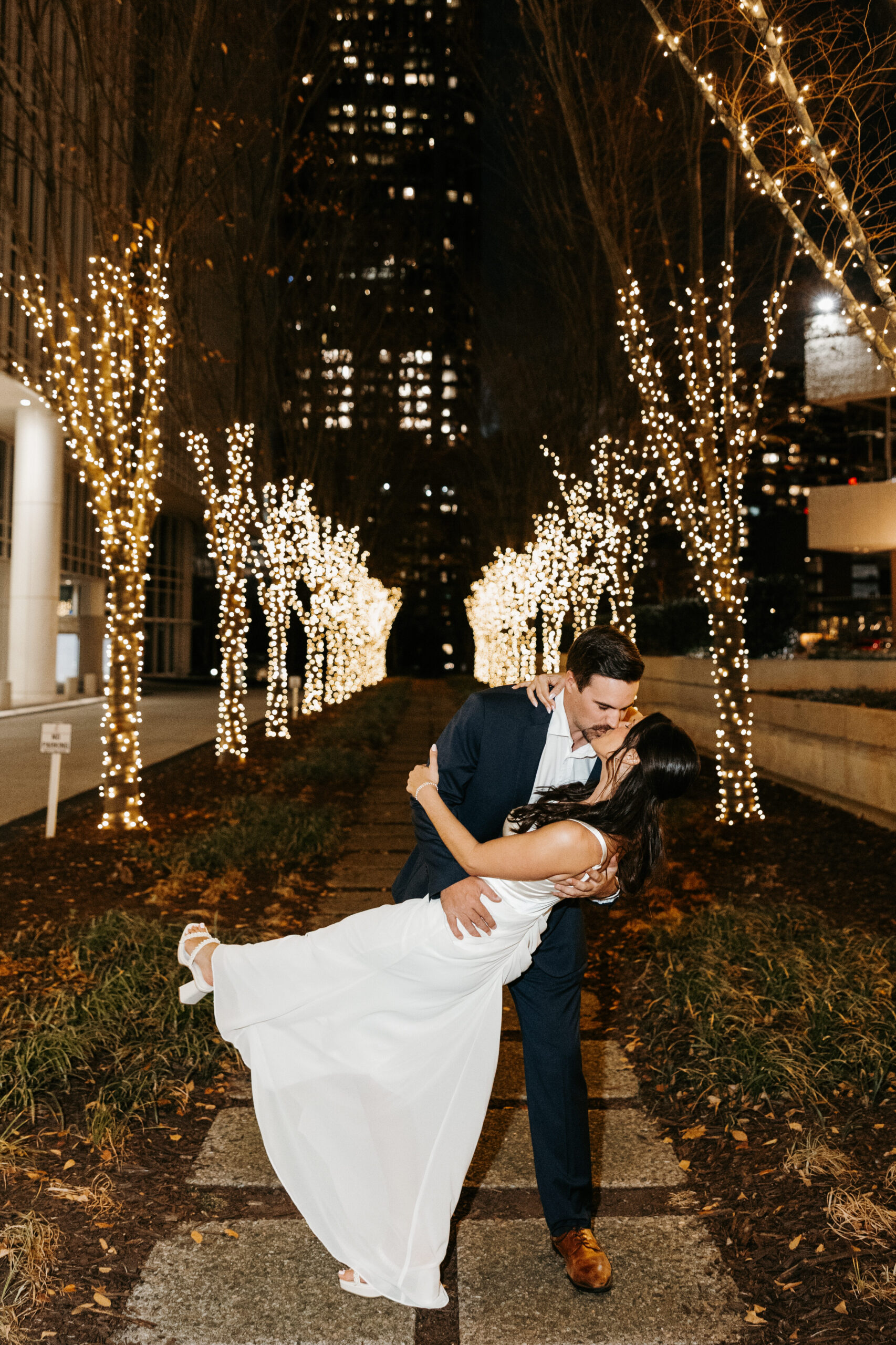 Olivia and Matt kicked off their wedding weekend with intimate portraits surrounded by glowing Christmas lights, setting a romantic and cozy tone for the celebration ahead. The Atlanta skyline paired with twinkling lights created a stunning backdrop that felt festive yet timeless—one of the many reasons Atlanta Weddings are so visually dynamic, especially with it being so close to holiday season.
